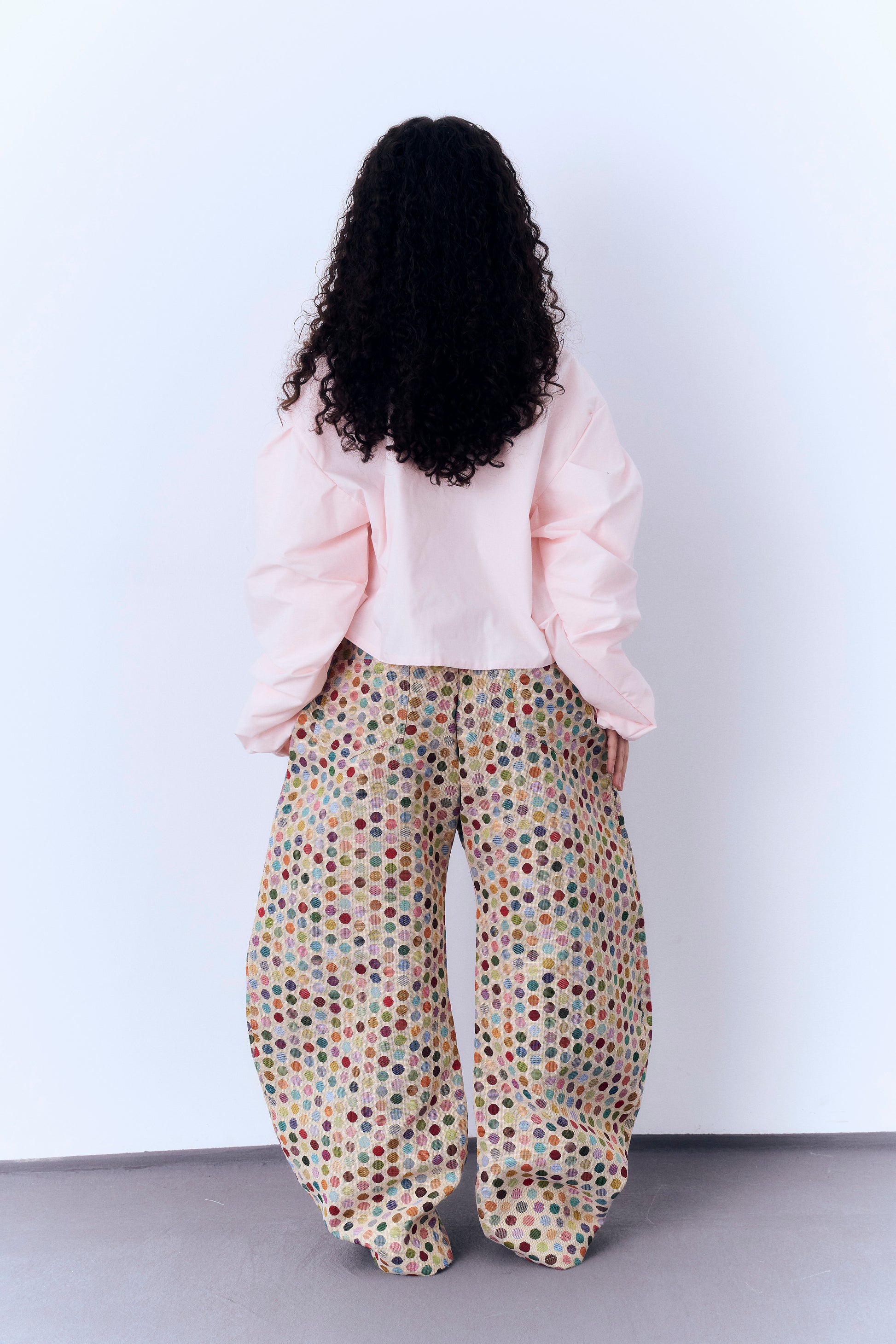diseñada con mangas arrugadas mediante manipulación artesanal del tejido, aportan textura y movimiento.