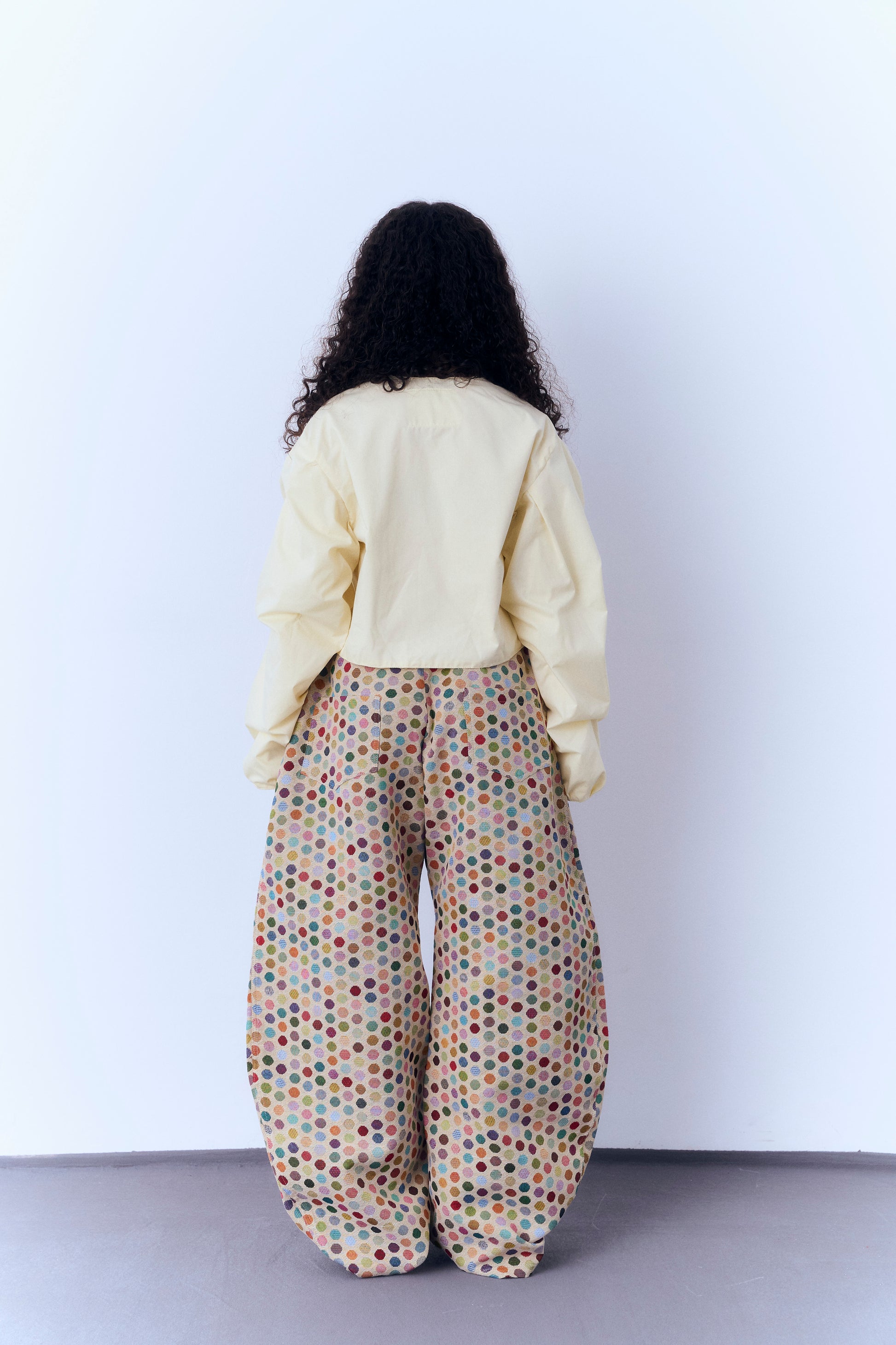 diseñada con mangas arrugadas mediante manipulación artesanal del tejido, aportan textura y movimiento.